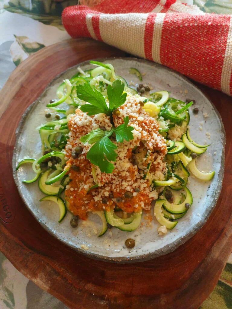 Preparate la salsa frullando ad alta velocità e per almeno un minuto i “germogli” di semi di girasole con la zucchina e del succo di limone. Il risultato dovrebbe essere molto bianco e corposo. Aggiungere il cetriolo, capperi, erba cipollina e della buccia di limone. Mescolate bene.
